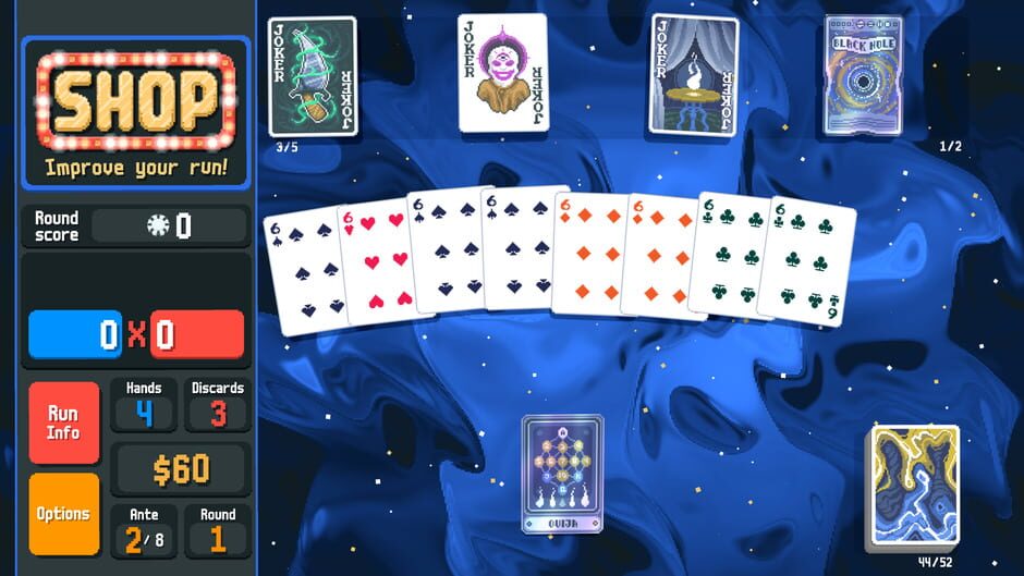 Balatro is a deck-building roguelite in which players construct poker hands to earn chips and overcome enemy blinds. The game features mechanics for enhancing a deck of playing cards, purchasing Jokers that modify hand effects, and discovering synergies to progress through increasingly challenging encounters.