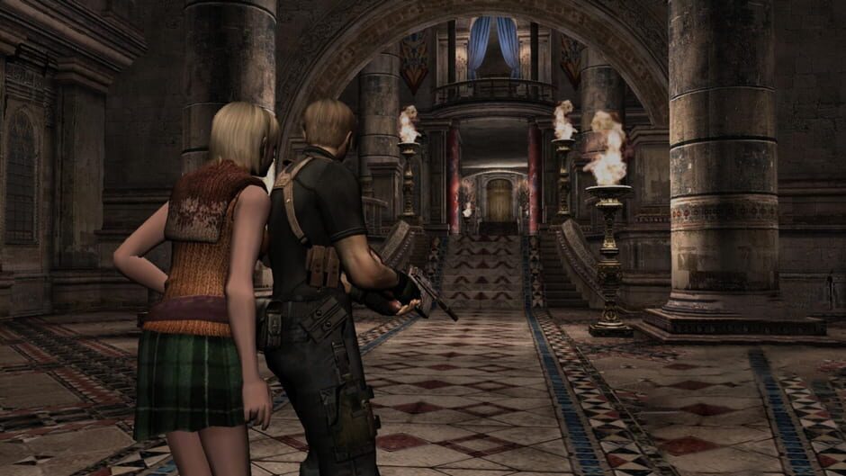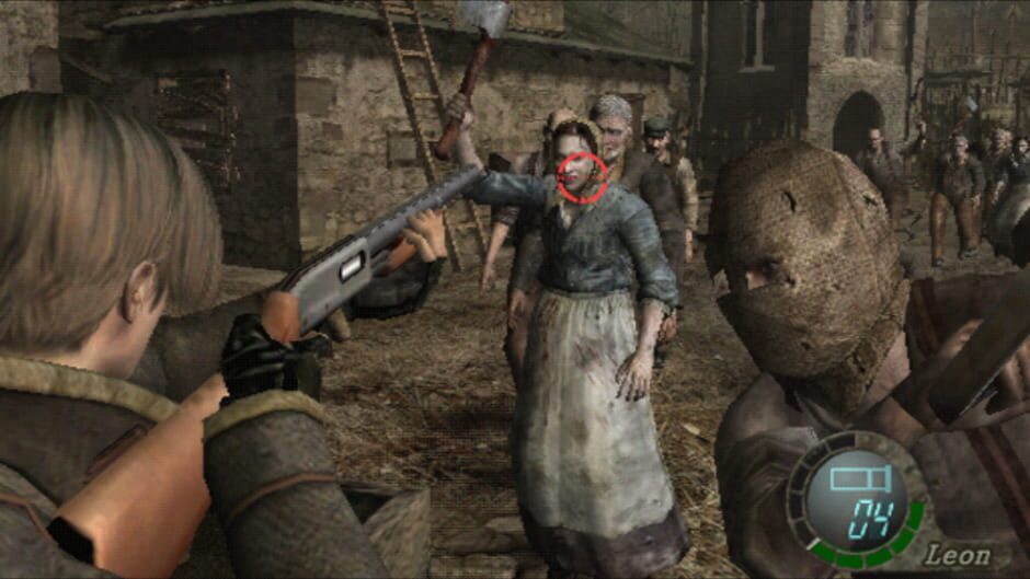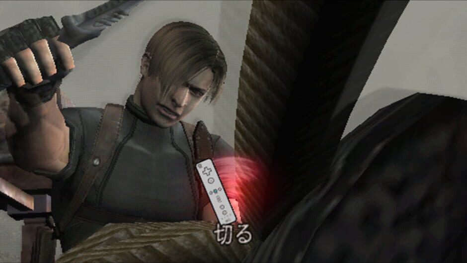 Resident Evil 4: Wii Edition includes the bonus content from the PlayStation 2 version and introduces several changes to accommodate the Wii Remote's motion controls. The aiming system features a larger reticle that changes from green to red when targeting an enemy, replacing the original narrow laser sight. A “quick knife” command is added, allowing automatic targeting of the nearest enemy or object, and motion-sensitive quick-time events supplement traditional button prompts. Visually, the game is comparable to the original GameCube version and generally improves upon the lower-resolution graphics of the PlayStation 2 release. However, a few graphical elements—such as low-detail herb models—appear to be carried over from the PS2 version. The Wii Edition also supports the classic controller, restoring traditional controls and the original laser sight aiming. Additional differences include a lower overall difficulty and slightly faster animations for Leon’s actions.